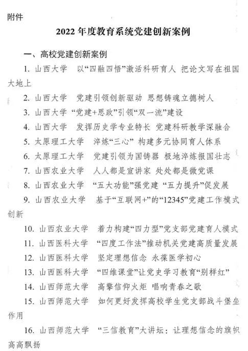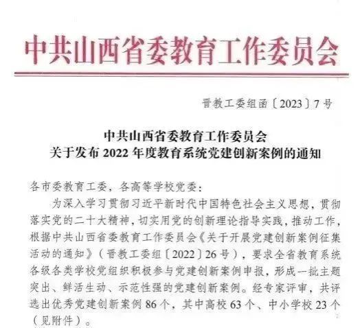 近日,中共山西省委教育工作委员会公布了2022年度全省教育系统党建创新案例评选结果。91探花