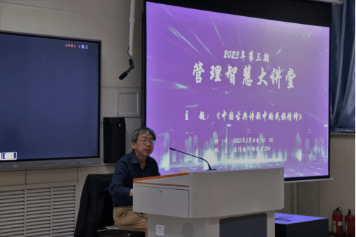 2023年第三期“管理智慧大讲堂”在立信阶教304举办。全国著名诗人、文学批评家金汝平教授为大家带来题为《中国古典诗歌中的民族精神》的专题讲座,学院党委副书记周志刚、辅导员马威威及2021级全体同学参加了本次讲座。