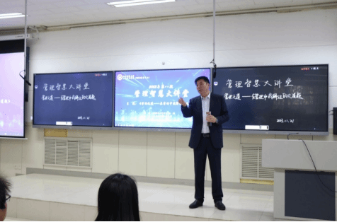 随后,郭建经通过丰富的经验悟出管理之道。一是“抓头头,定调调”。“抓头头”就是人力资源管理,培养人选人用人使人;“定调调”就是选对方向才可能实现超越。二是定个小目标,终身学习,敢于创新。三是合作伙伴的稳定性。四是发展方向的地域适配性。最后,他用寓言故事《人生的三大陷阱》警示同学们,并寄语全体同学,“如果天一直黑暗,那么我们就要学会在黑暗中行走,或许有一天天亮了,我们就可以换一种方式展翅高飞”。