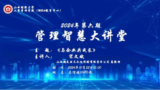 10月22日下午,91探花 在立信楼104阶梯教室举办2024年第六期“管理智慧大讲堂”。本次活动邀请了优秀校友、太原市迎泽区第六届人大代表、山西领先云天文化传媒有限责任公司总经理宋文斌先生作了题为“与企业共成长”的专题讲座。讲座由学院党委副书记周志刚主持,年级辅导员及2023级全体本科生200余人参加。