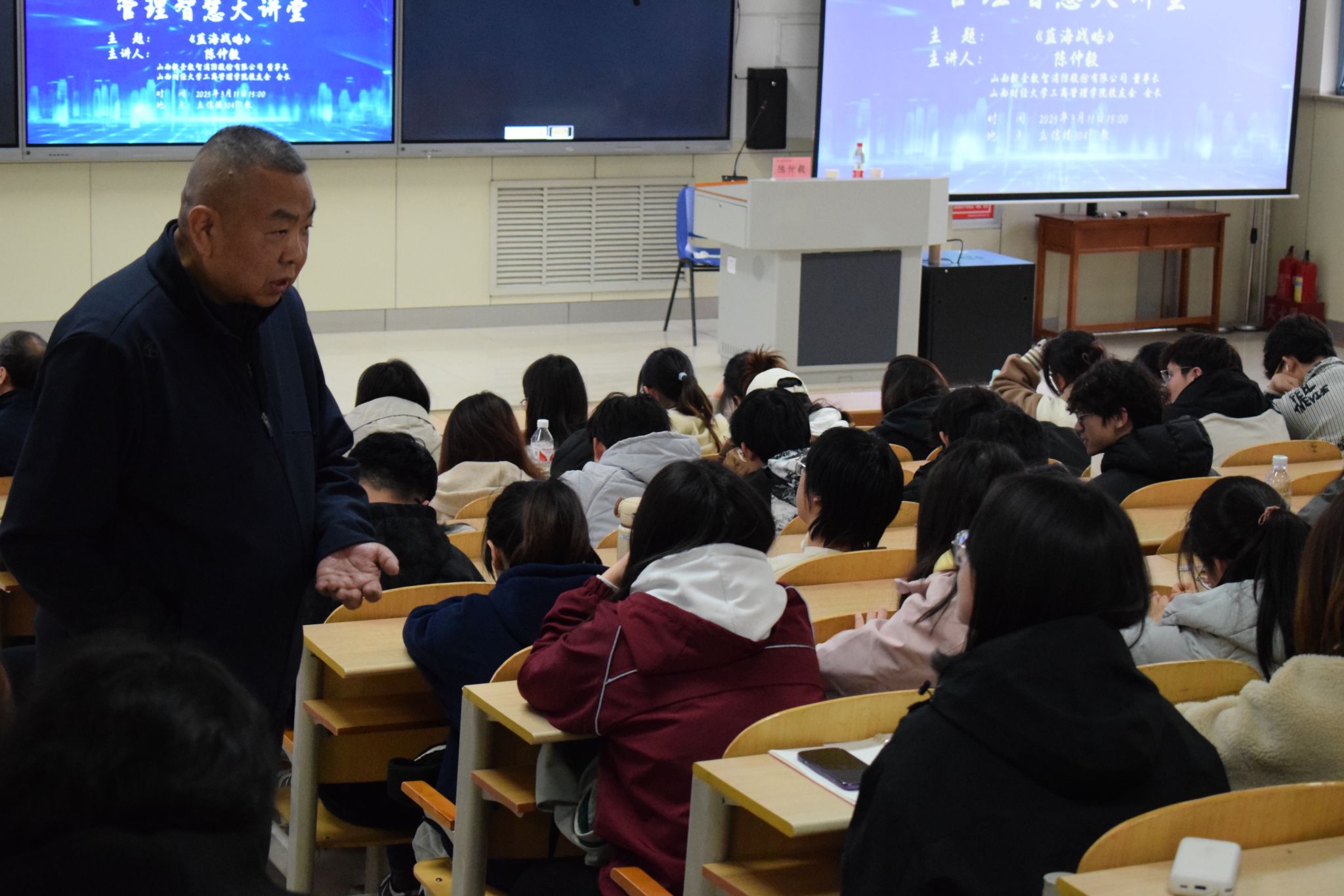 在互动交流环节,同学们围绕“蓝海战略”的理论与实践积极思考、踊跃发言。如聚焦具体行业案例,探讨当前适合通过差异化与低成本路径开拓新市场的领域,智慧消防解决方案的风险管理及文物古建市场的竞争力构建等。陈仲毅先生逐一回答了同学们的提问,并就部分专业问题进行了深入浅出的阐释。