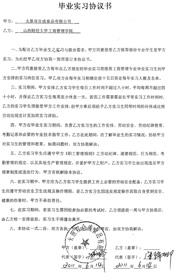 毕业实习协议--太原双合成食品有限公司