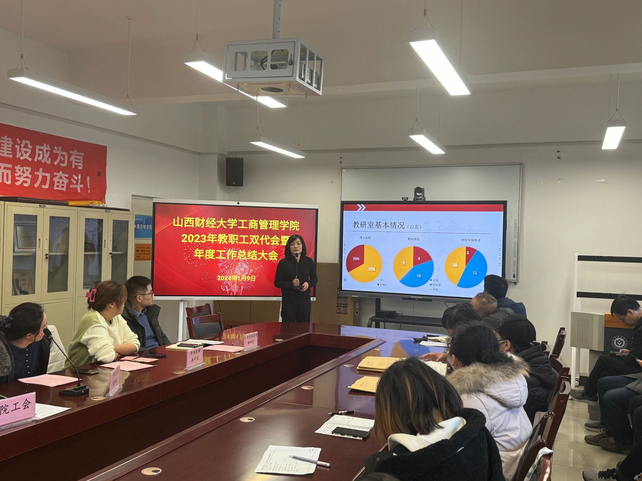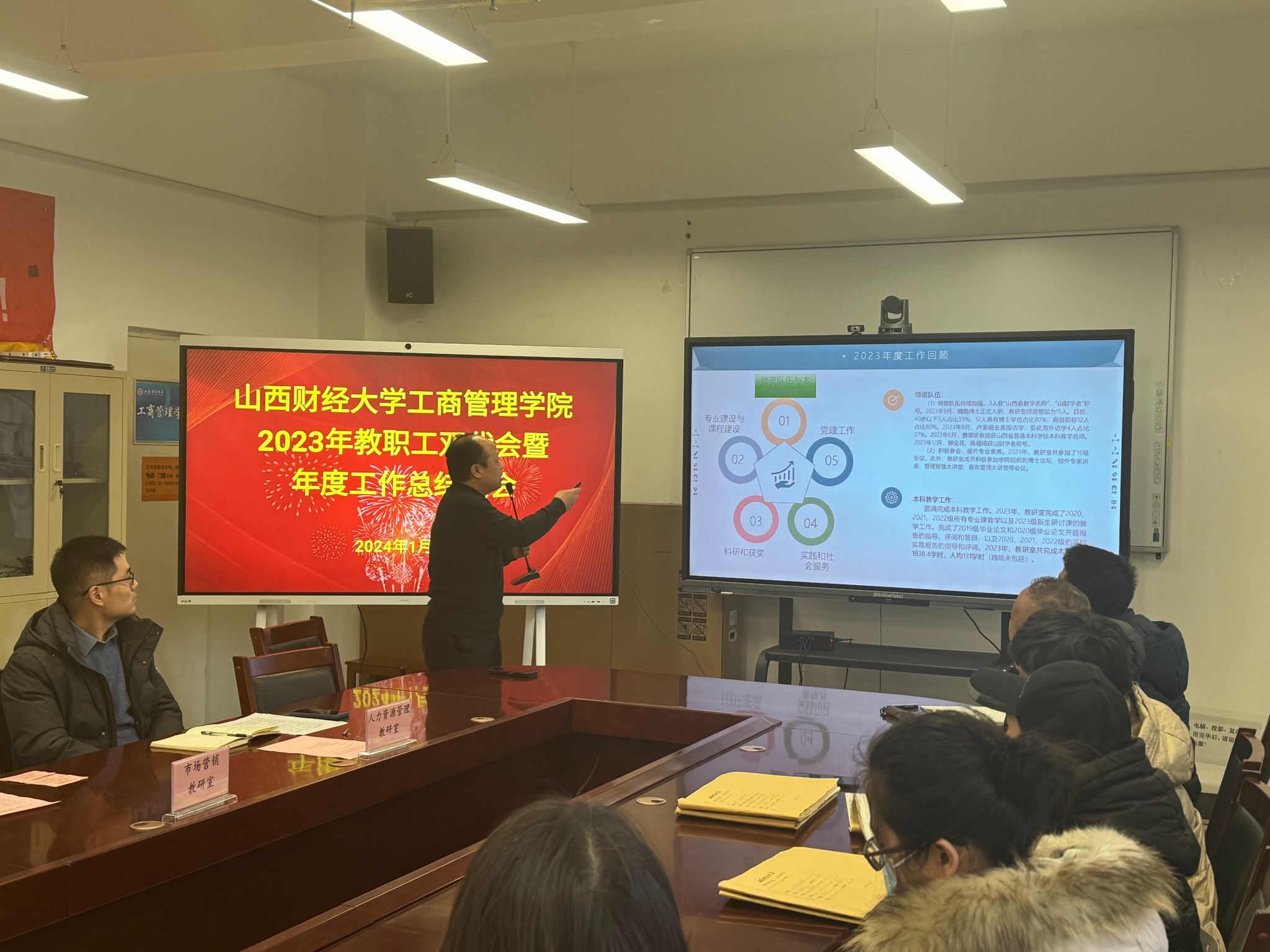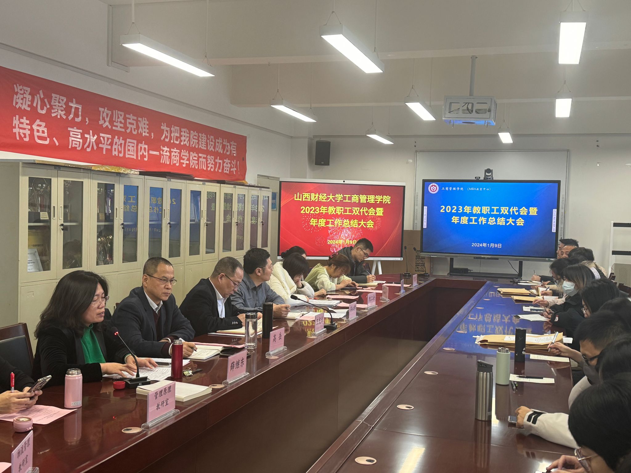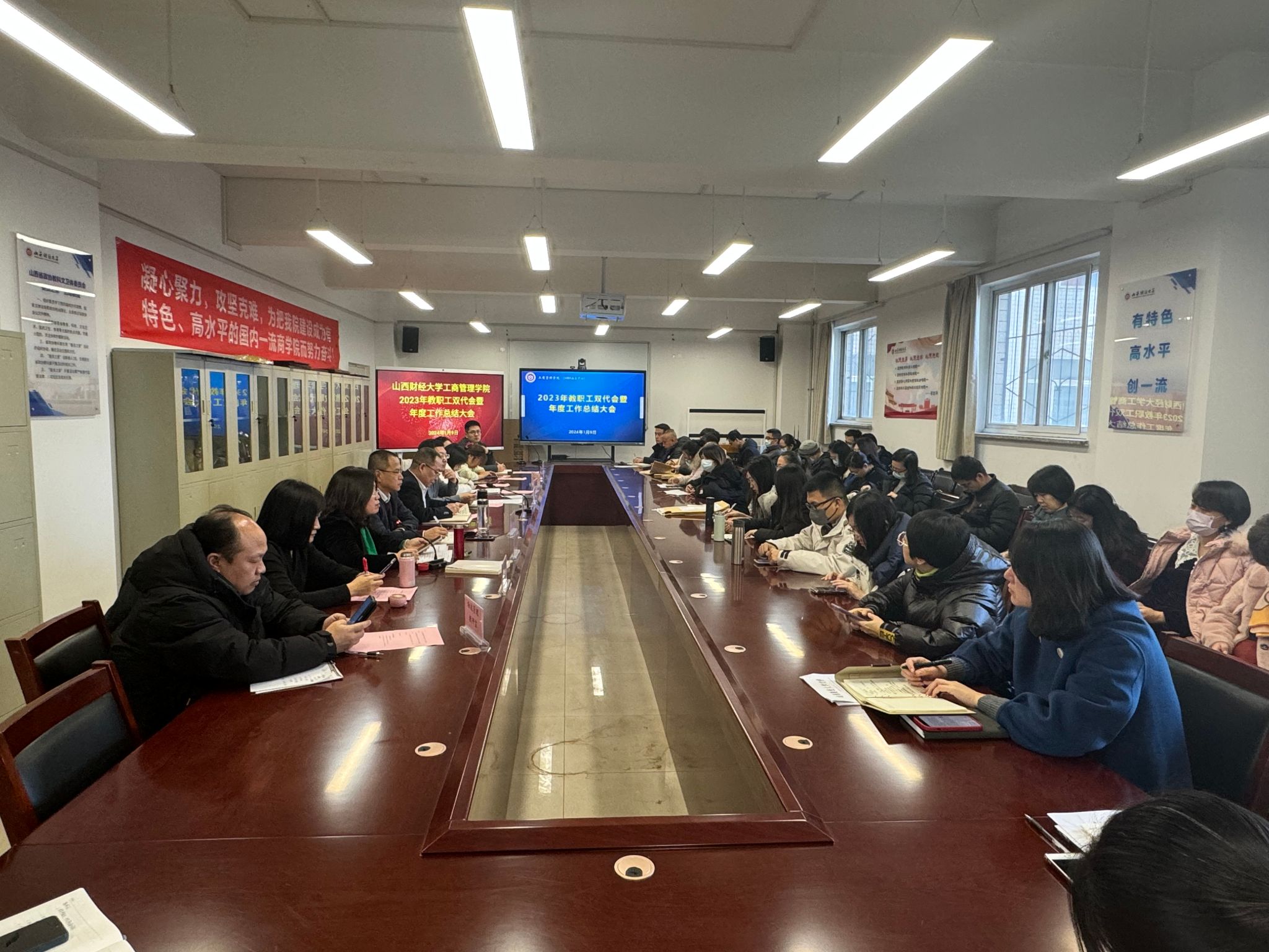 在会议室举行了2023年教职工双代会暨年度工作总结大会。学院领导、全体教职工参加会议。会议由学院党委书记高岳主持。