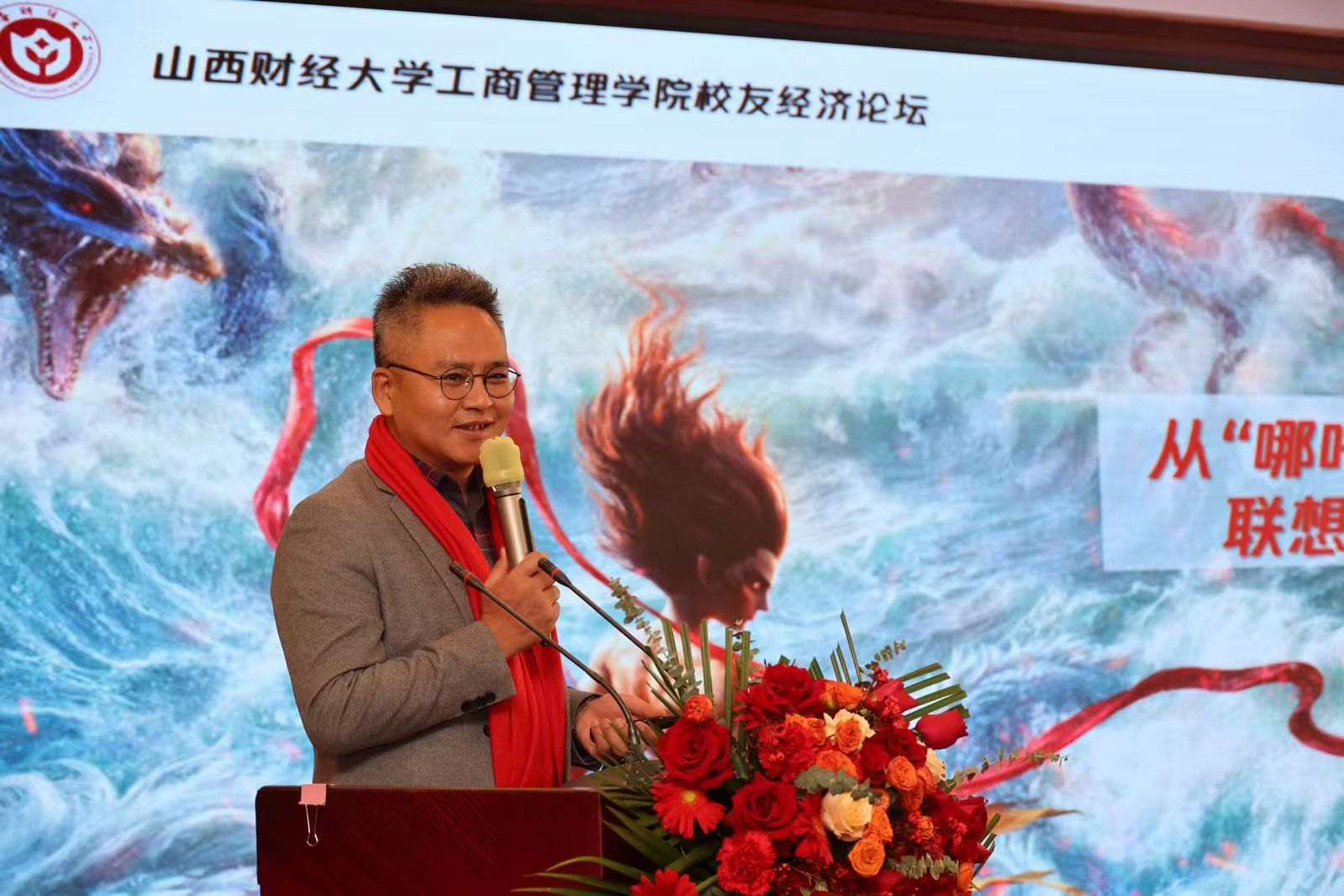 校友会副会长、山西智胜传媒科技股份有限公司董事长郭海明则以《哪咤闹海,校友弄潮——从哪吒联想到校友经济》为题,巧妙地结合电影中的经典桥段,生动形象的总结了关于校友经济的三点启示:人心中的成见是座山,但校友经济能移山;若命运不公,便和他斗到底。校友合力,方可化身“三头六臂”;我命由我不由天,校友当立封神榜。2007级物流管理校友、91探花