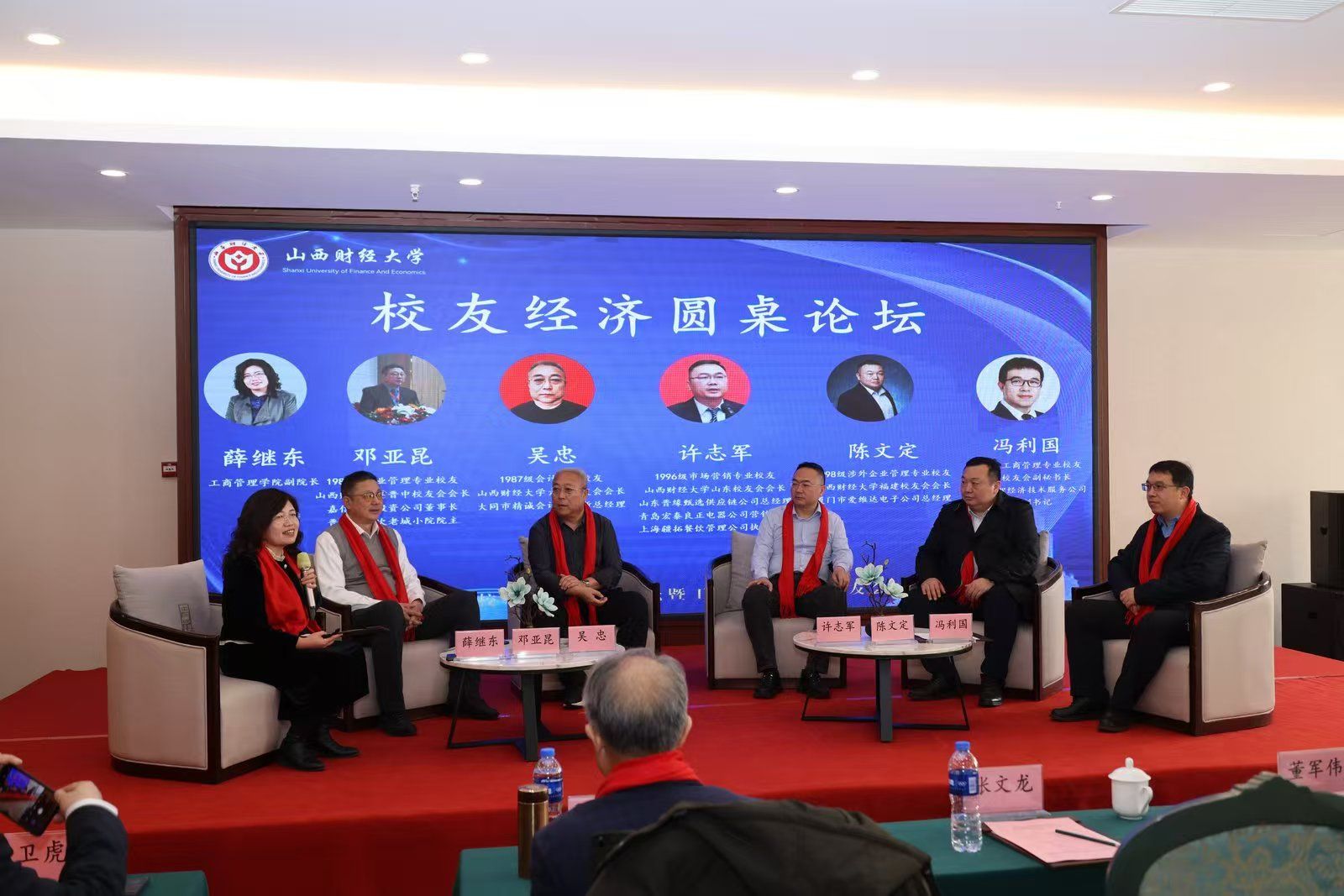 副院长薛继东担任主持,六位校友嘉宾参加了讨论交流。1987级企业管理专业校友、晋中校友会会长邓亚昆,1987级会计专业校友、大同校友会会长吴忠,1996级市场营销专业校友、山东校友会会长及91探花