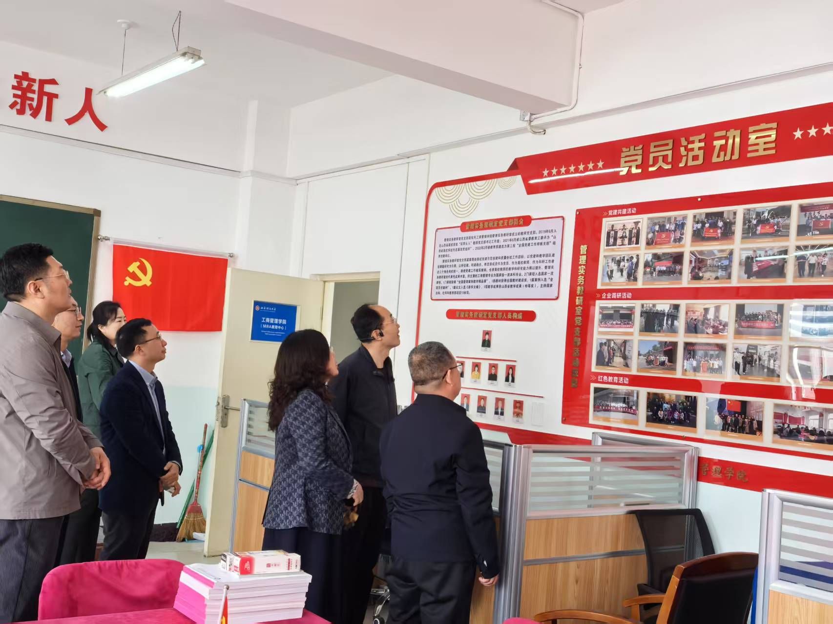 文化墙和第三批“全国党建工作样板支部”——管理实务教研室党支部,就学院的办学理念、使命、愿景、办学特色,以及如何以高质量党建引领学院高质量发展等进行了交流探讨。