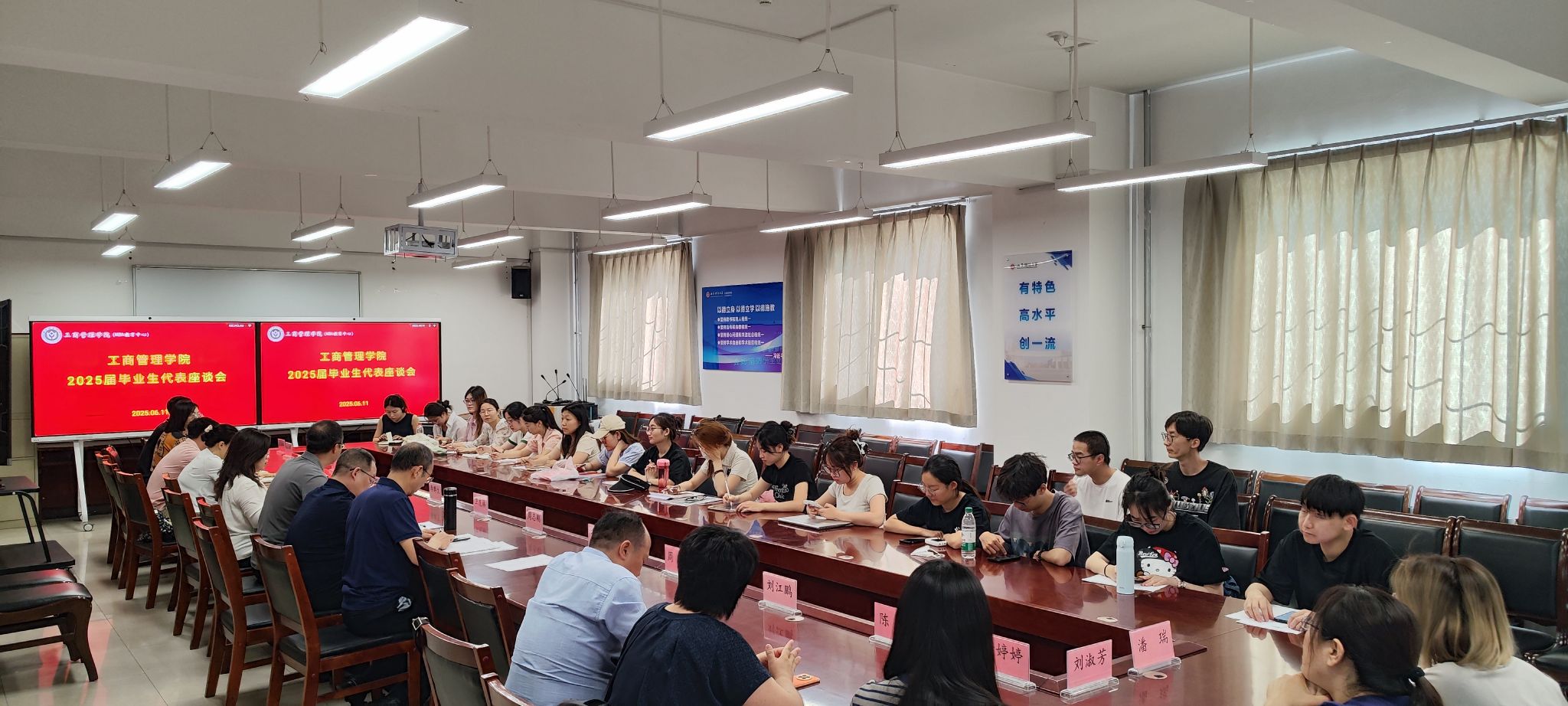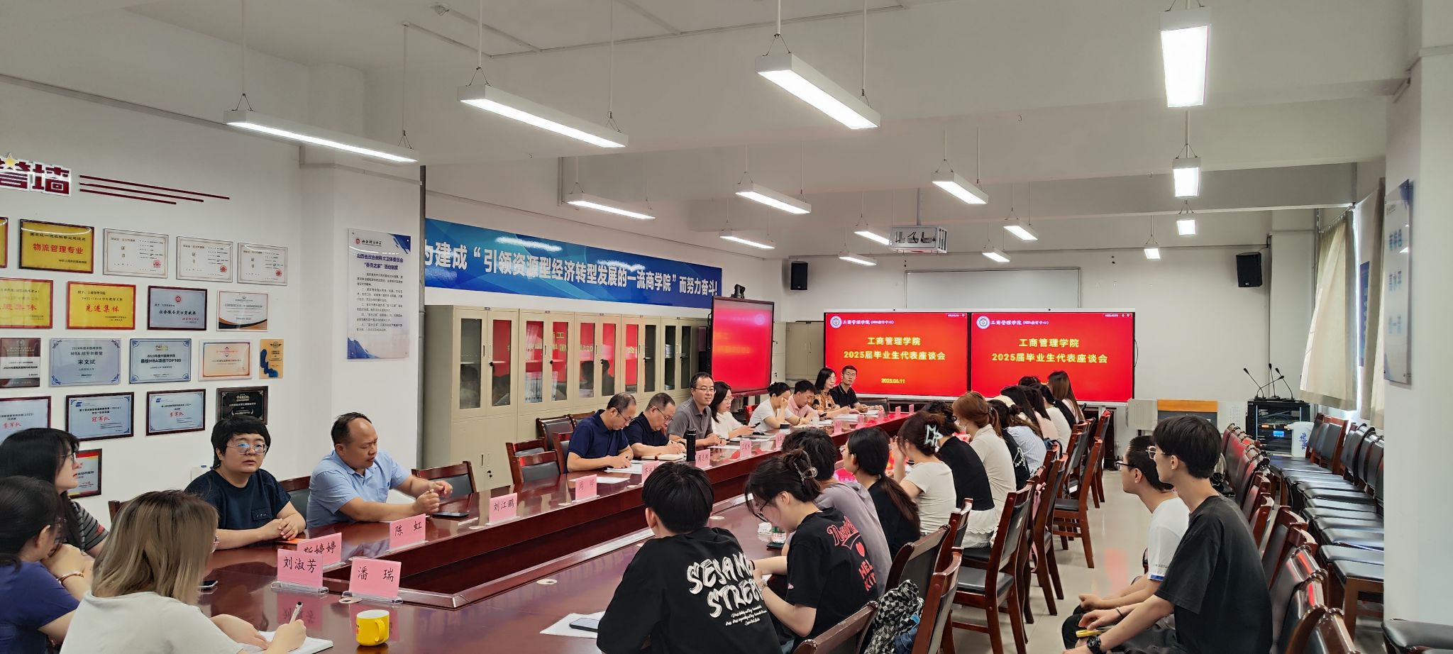 在会议室举行2025届毕业生代表座谈会。2025届本科毕业生代表、学硕和博士毕业生代表等20余人参加会议。学院领导班子全体成员、各教研室主任、全体辅导员、教学秘书、科研秘书等出席会议。会议由学院党委书记李群生主持。
