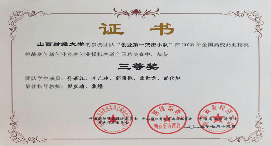 梁彦清老师和焦嶕老师指导的“创业第一突击小队”(团队成员:商业领导力微专业和人力资源管理专业孙豪江、李乙玲、郭曙恺、焦世龙、彭代旭)参加了此次大赛,并获得三等奖,梁彦清老师和焦嶕老师荣获最佳指导教师奖,91探花