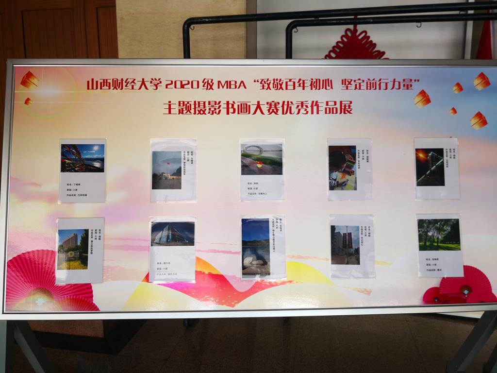 2020级MBA全体学员把对党的恩情、对社会主义的信仰、对人民的热爱融入工作、生活、学习当中,积极参与本次书画摄影展以及红歌展演等活动,用画面定格精彩、用毛笔书写热爱、用歌声赞颂党恩。经过两个月的紧张筹备、公示、投票等阶段,评选出摄影作品一等奖1名、二等奖2名、三等奖3名、优胜奖7名,书法作品一等奖1名,二等奖1名。