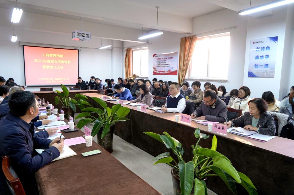 学院院长卫虎林按照年初学校下达的目标总体任务,从2021年学院工作回顾、明年工作思路与重点工作两个方面作了汇报。一年来,学院全面实施推进一流专业建设行动计划、一流课程建设行动计划、标志性成果突破和社会服务行动计划、案例开发与建设行动计划、积极推进商科国际认证行动计划等“五大行动计划”,完成了学校目标任务书的主要内容,学院“十四五”高质量发展实现良好开局。在人才培养、科学研究、师资队伍、专业建设与教学、对外合作交流与社会服务、对外宣传等多个方面,都有新的亮点。第一,学院四个本科专业实现省级以上一流专业全覆盖,工商管理、市场营销获得国家一流专业建设点。第二,教学研究获得新的突破。获得教育部新文科建设项目1项,教育部产学研合作协同育人项目2项,获得2021山西省教学成果特等奖一项。首届国家教材奖获得一个一等奖,一个二等奖。新增省级一流课程一门。第三,科研项目有新发展。获得国家自科基金项目1项,教育部人文社科项目3项,省级科研项目29项。获得科研经费390.63万元。获得山西省科技进步二等奖1项。第四,高层次人才引进取得新成绩。引进或学校内部调整新增博士7人,具有博士学位教师达到51人,占比为60.7%。第五,对外合作交流继续稳步推进。新建校外实践基地10个,与山西省经建投集团开展了深度合作。第六,案例开发与建设工作取得新成绩。圆满举行“长城电气杯”管理案例大赛。第七、91探花