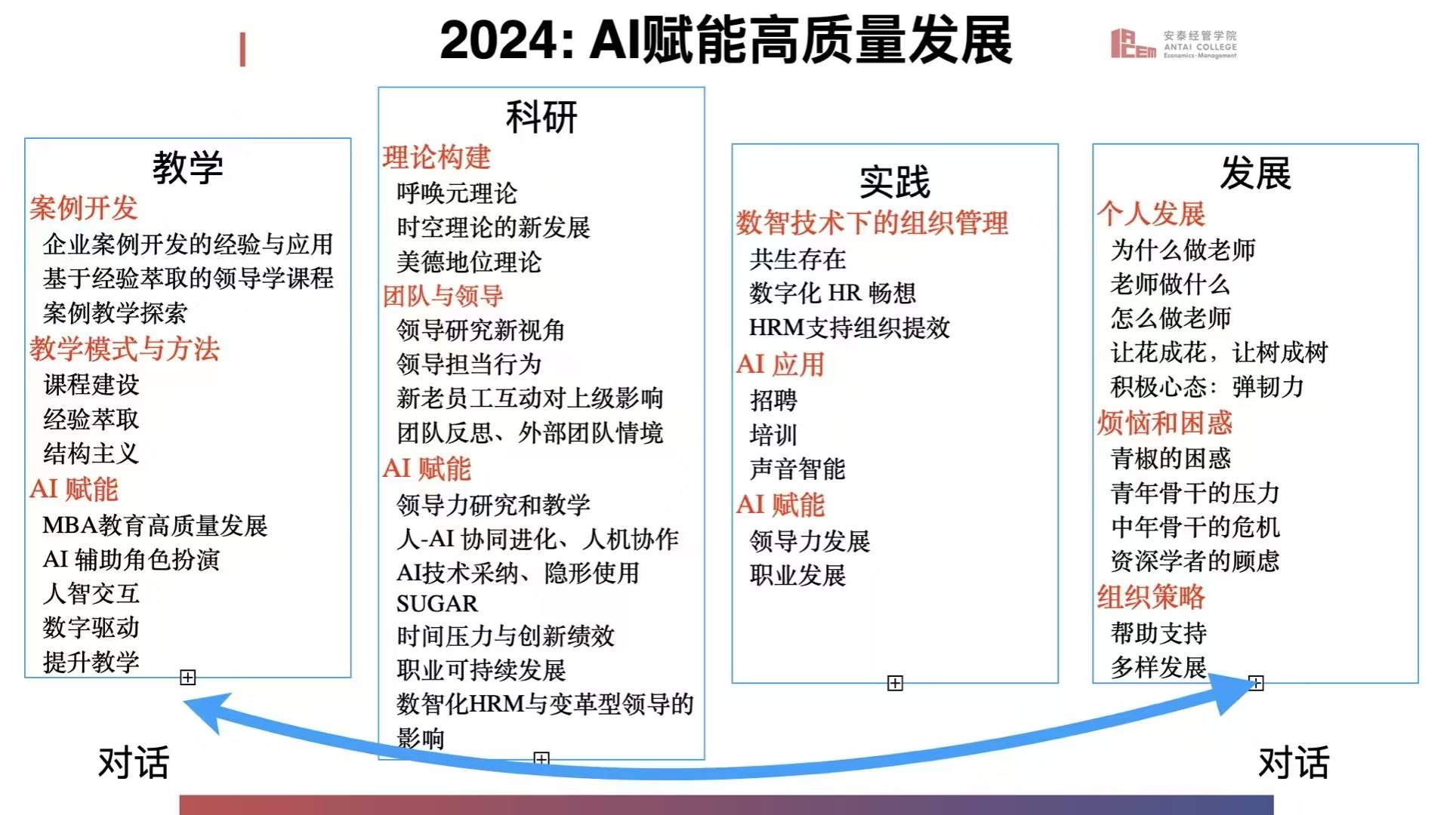 在新时代下,如何通过AI 赋能高质量发展,促进组织不断创新,转型升级,以实现可持续发展是许多学者和组织关注的话题。本次研讨会聚焦AI 对组织中的个体和团队、管理和领导、结构与文化等方面产生的巨大影响,探索AI 时代组织行为与领导力的教学创新和科研突破。