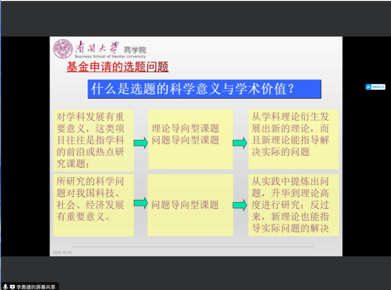 在国家自科基金项目分享中,李勇建教授聚焦管理科学部的资助定位,强调其以“科学方法”探索管理与经济活动客观规律,鼓励原创性研究与面向国家重大需求的应用基础研究,提炼出基金申请三要素——创新思想、研究实力、写作技巧。针对选题,他区分了理论导向型与问题导向型课题,强调需立足自身研究基础,避免盲目追逐热点;在研究内容撰写上,明确青年项目、面上项目、重点项目的成果量化目标,提醒避免层次不清、内容空泛等常见问题;在研究基础撰写上,注重关联性与业界合作,在图表等描述方式上进行适度创新。