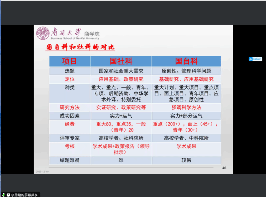 在两类项目核心差异对比与选择策略环节,李勇建教授借助清晰的表格,从选题导向、定位、项目种类、研究方法、经费支持、评审专家、考核要求、结题难度等维度进行全面解析,并给出明确抉择建议:基础研究与应用基础研究优先选自科,应用研究与政策研究适配社科;教授级学者可冲击社科重大项目,青年学者建议先尝试自科项目,积累经验后再灵活调整。