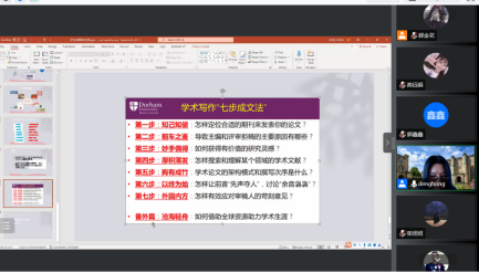 邓红老师围绕研究生期间英语学习、科研提升和职业规划等方面展开。首先,邓老师结合自己的求学经历分享了研究生英文学习经验。听:泛听TED各领域演进,精听知名学者演讲;说:看和模仿脱口秀、美剧等;读:读英文顶刊论文和商业实践类文章;写:积累经典词句,琢磨大牛写作技巧。其次,邓老师围绕研究生期间“如何确定感兴趣的科研方向和选题?如何发现研究问题?如何提升论文写作水平?科研进度时间点如何安排?”等重要问题进行了分享。最后,邓老师总结了“学术写作七步成文法”,即第一步,知己知彼;第二步,前车之鉴;第三步,妙手偶得;第四步,厚积薄发;第五步,胸有成竹;第六步,以终为始;第七步,外圆内方。本次讲座极大地激发了91探花