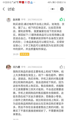 17:20,微信总结讨论题的核心观点:“购物渠道主要有线下的店面渠道,其相对优势为:触摸和感受产品、个人服务、降低风险、即时满足、娱乐及社交互动、现场浏览、现金支付或移动支付等;线上的互联网渠道,其相对优势为:产品选择范围更深、更宽、商品评价信息更多、能够为消费者提供更多关于产品和服务的个性化信息、扩大市场存在、丰富的顾客信息。”