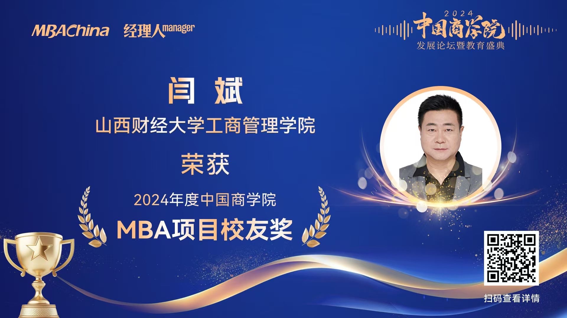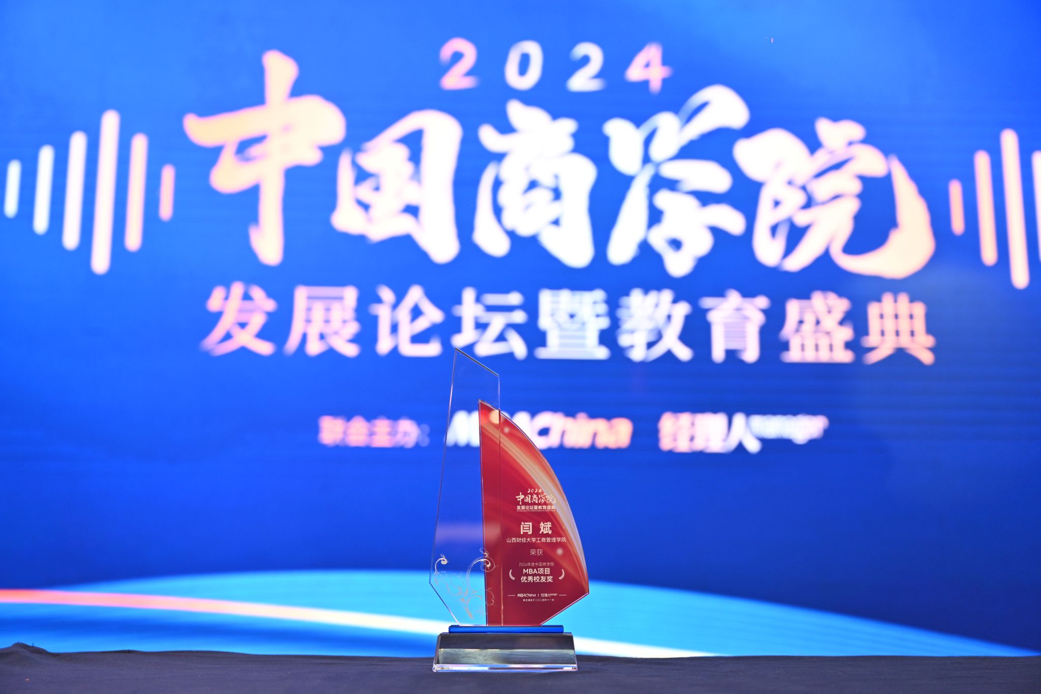 EMBA校友、MBA校外导师、山西海之韵信息技术有限公司董事长闫斌,凭借其在企业创新发展中的卓越贡献和商业领导力方面的杰出表现,荣获“2024年度中国商学院MBA项目优秀校友奖”。