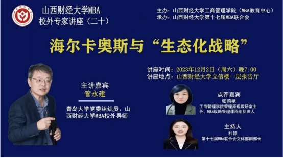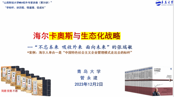 MBA校外导师管永建老师带来题为《海尔卡奥斯与“生态化战略”》的专题讲座。本期讲座得到MBAChina网站的同步直播,2022级、2023级MBA学员、部分MBA教师、MBA校友线上线下共2000余人参加了讲座。