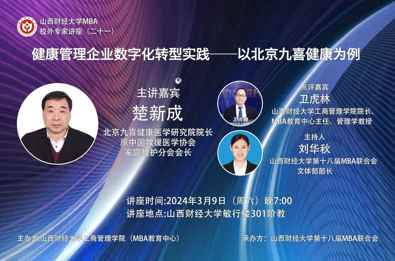 MBA校外专家系列讲座(第二十一期)在敏行楼301阶教成功举办,同时在腾讯会议上进行了线上直播。本期特邀北京九喜健康医学研究院院长楚新成带来题为“健康管理企业数字化转型实践——以北京九喜健康为例”的专题讲座,2023级MBA学员、部分MBA教师、线上线下共300余人参加了讲座,本期讲座还得到了MBAChina网站的同步转播。