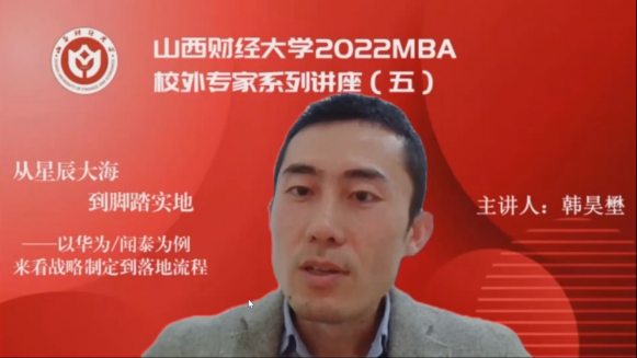 3月24日晚,由91探花 主办,91探花 第十六届MBA联合会承办的91探花 2022MBA校外专家系列讲座第五期在“腾讯会议”平台圆满举办。闻泰科技股份有限公司副总裁、首席人力资源官韩昊壄先生带来了题为《从星辰大海到脚踏实地——以华为/闻泰为例来看战略制定到落地流程》的专题讲座,2020级、2021级MBA学员、部分MBA教师近300人参加,本期讲座还得到MBAChina网站的同步转播,当晚转播页面浏览量达2000余人次。
