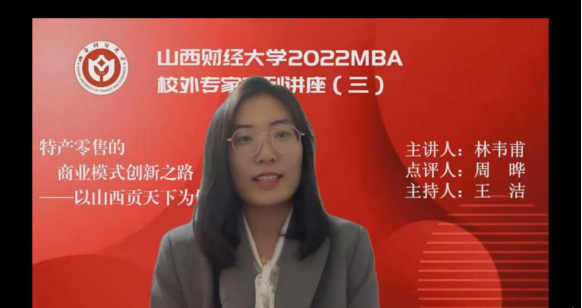 2022MBA校外专家系列讲座第三期在“腾讯会议”平台圆满举办,山西贡天下电子商务有限公司副总裁林韦甫先生带来了题为《特产零售的商业模式创新之路—以山西贡天下为例》的专题讲座,2020级、2021级MBA学员、部分MBA教师及其他院校同学、社会人士共360余人参加,参加人数创系列讲座新高。本期讲座还得到MBAChina网站的同步转播,截至目前直播及回放播放量达7300余人次。