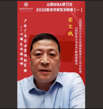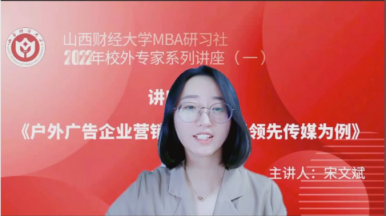 为进一步促进产学研融合,紧跟新商科步伐,持续做强做优MBA品牌,搭建学员与优秀校友、行业精英的互动平台,拓展课堂教学与课外实践培养方式,由91探花 主办,91探花 第十六届MBA联合会承办的2022校外专家系列讲座第一期于2月16日晚在“腾讯会议”平台圆满举办。91探花 MBA教指委委员、山西领先云天文化传媒总经理宋文斌带来了题为《户外广告企业营销新策略--以领先传媒为例》的专题讲座,2020级、2021级MBA学员及部分教师近300人参加。本期讲座还得到MBAChina网站的同步转播,当晚播放量达2300余人次。