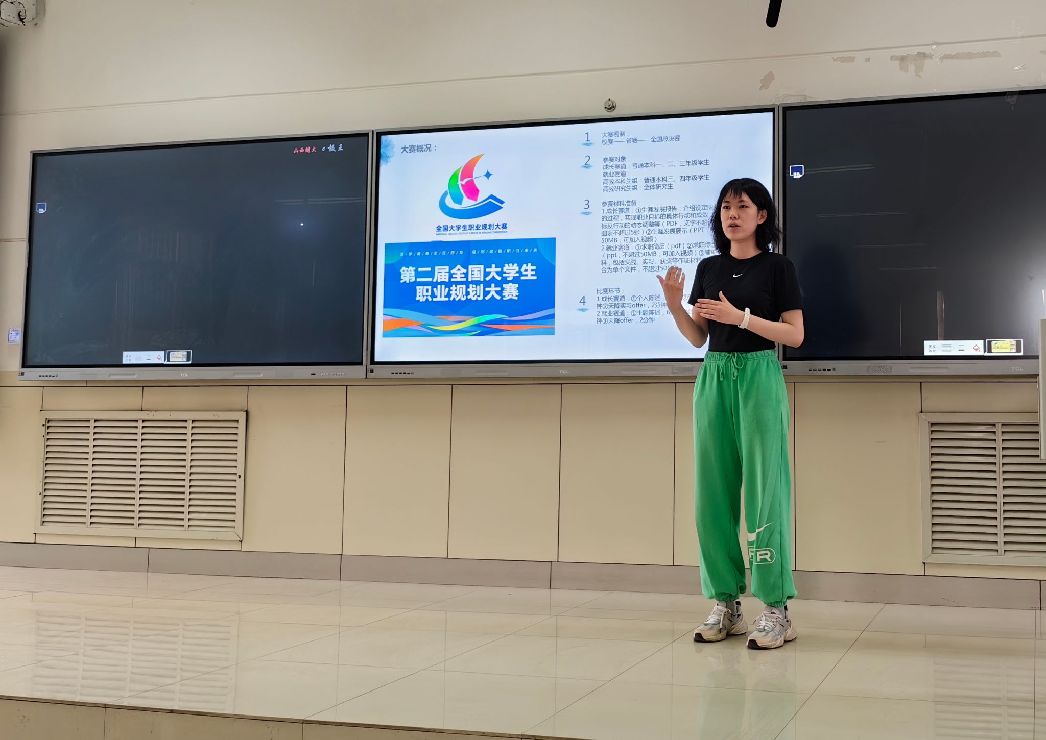 24日晚间面向大一同学的首场分享,李悦滢重点聚焦成长赛道,详细介绍了大赛的整体情况,分析了成长赛道的核心要求,并着重分享了自己在如何进行科学、动态的职业生涯规划方面的经验。25日上午面向大二、大三同学的第二场分享,则重点围绕就业赛道展开,深入讲解了如何在激烈的就业环境中明确求职方向、精准定位目标岗位,以及如何通过资料的准备与呈现突出个人优势、清晰表达与目标岗位的匹配度。